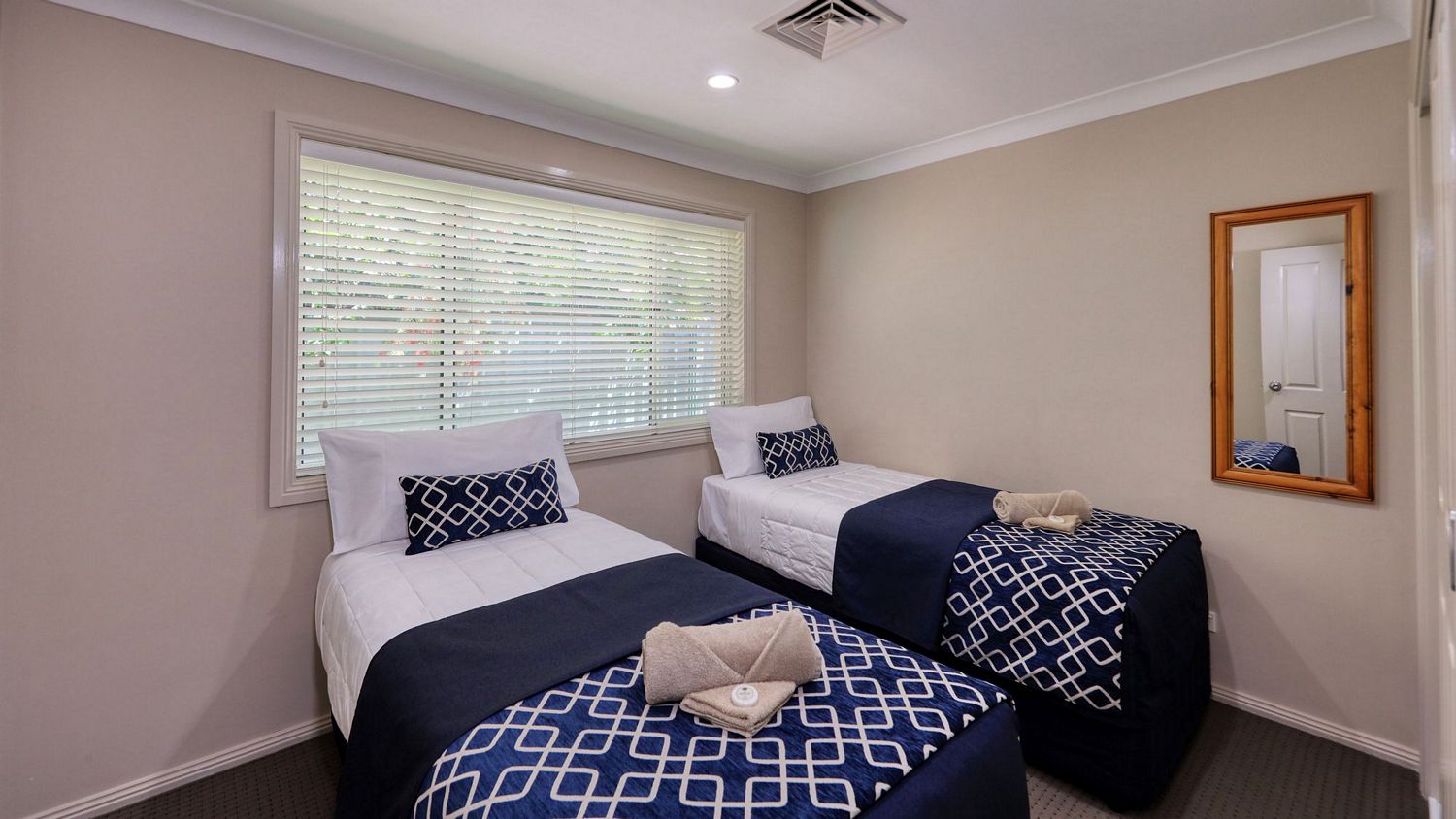 • Separate bedrooms, deluxe pillowtop queen size bed in main and two long singles in second bedroom,
