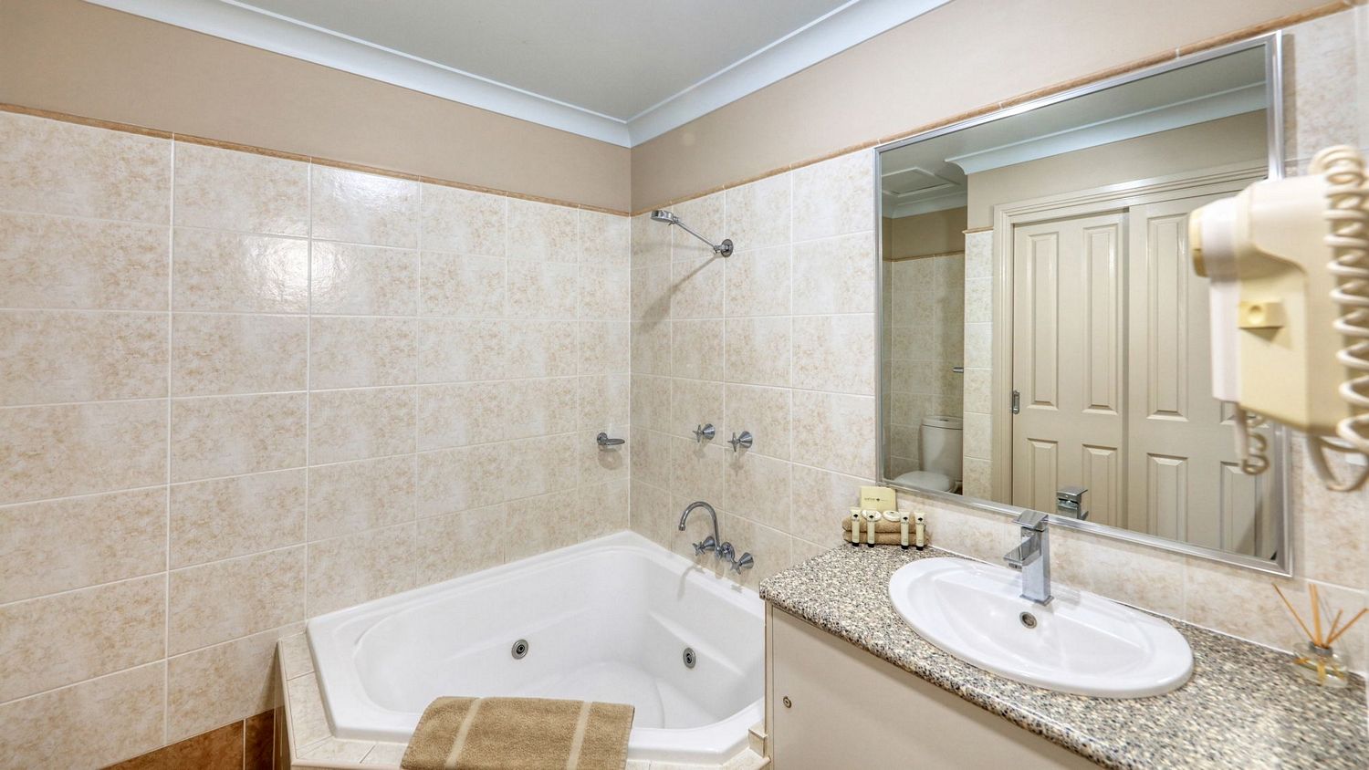 • Full size bathroom (1 room with walk in shower. The other two rooms have shower over corner spa baths),